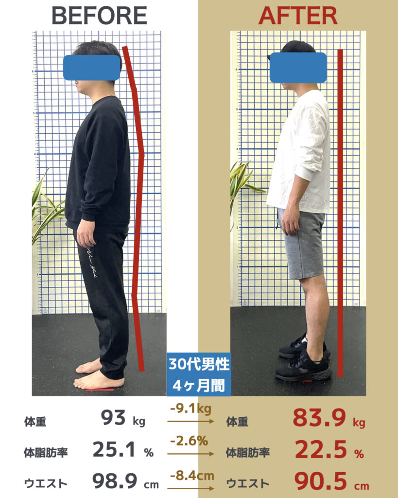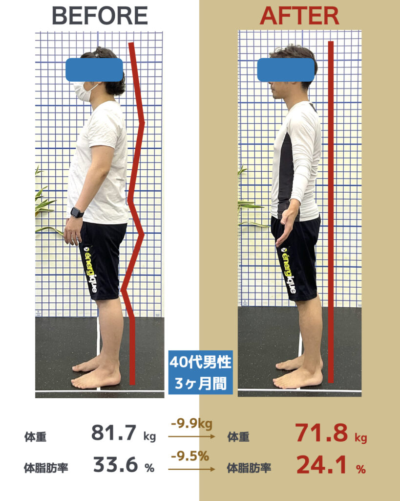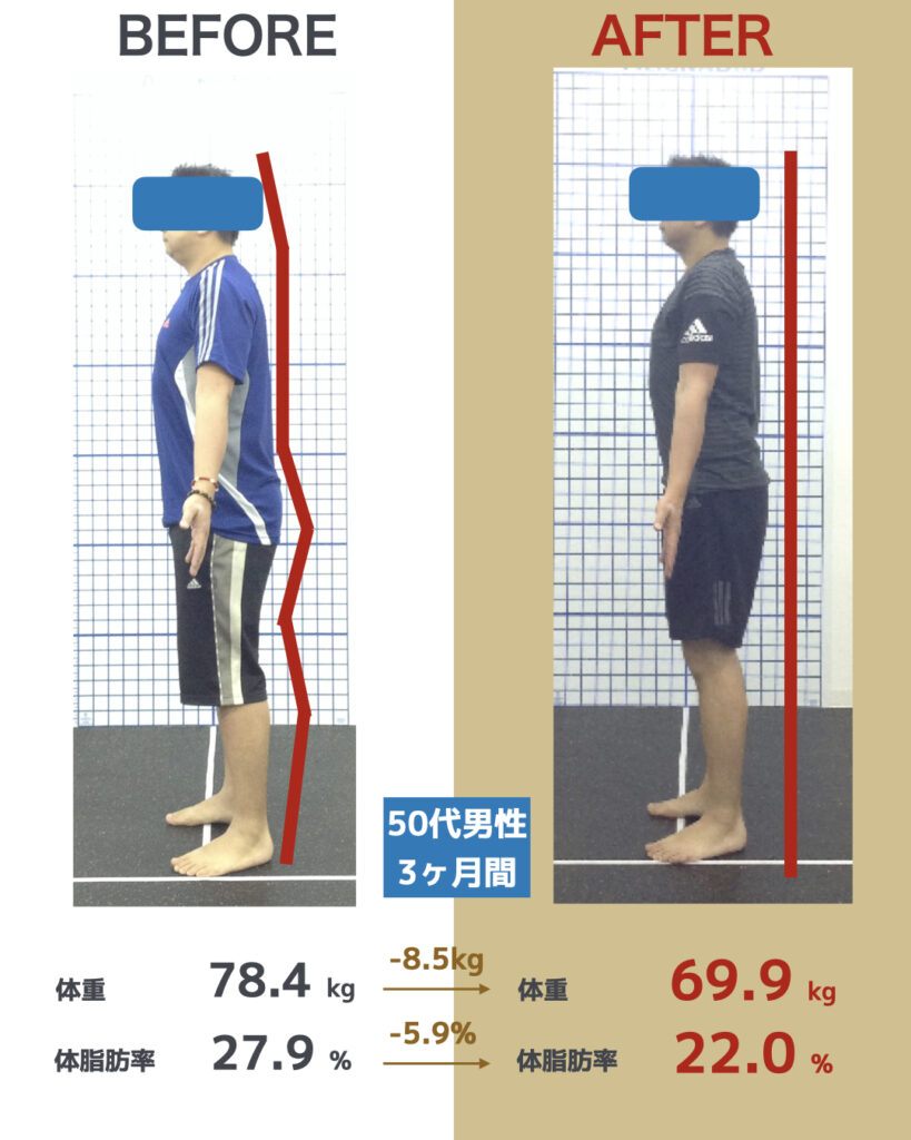 3ヶ月で体重・体脂肪率ともに大きく変わり、姿勢も整ってきたことで、立っている時や歩いている時の感覚がかなり楽になりました。
